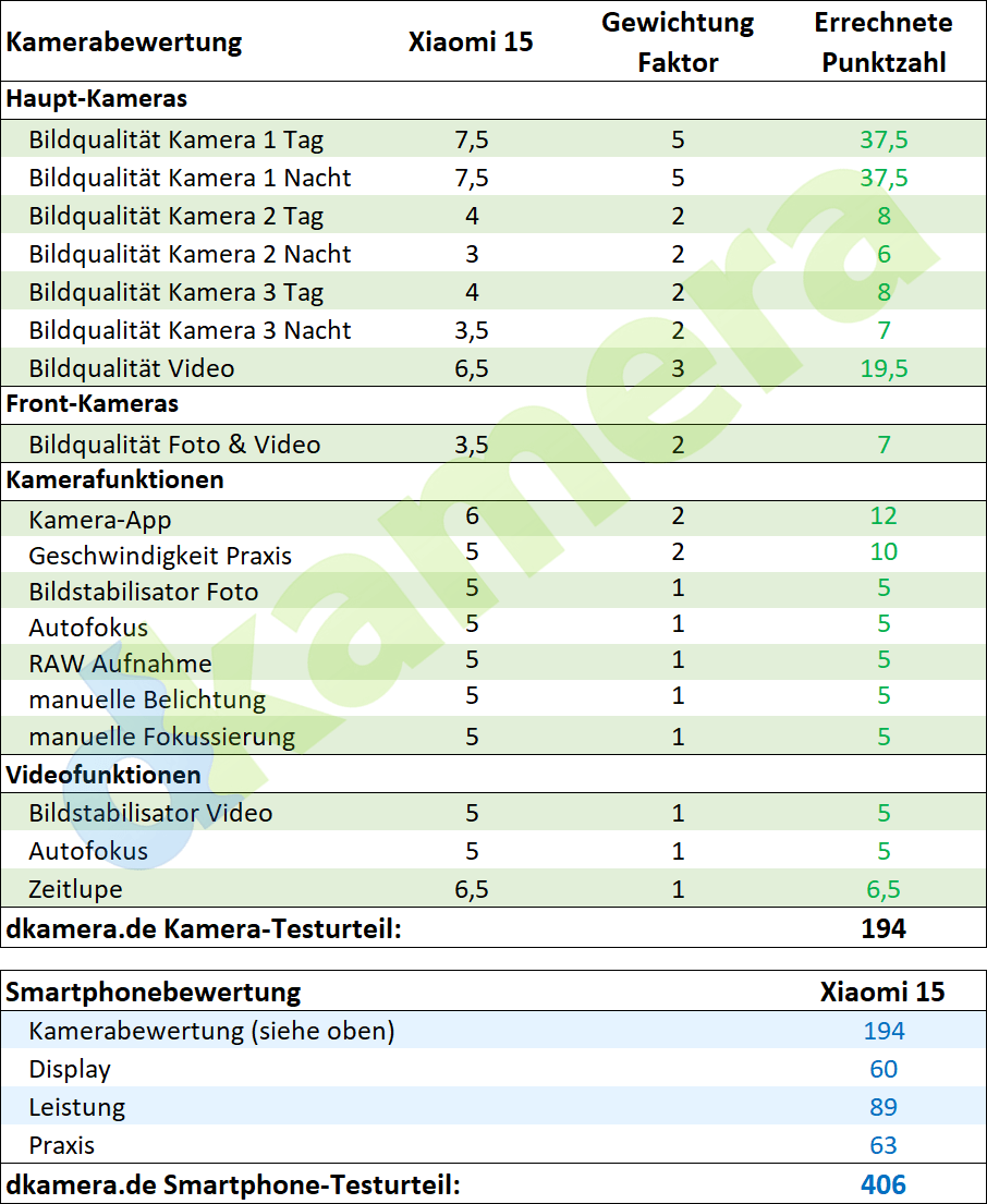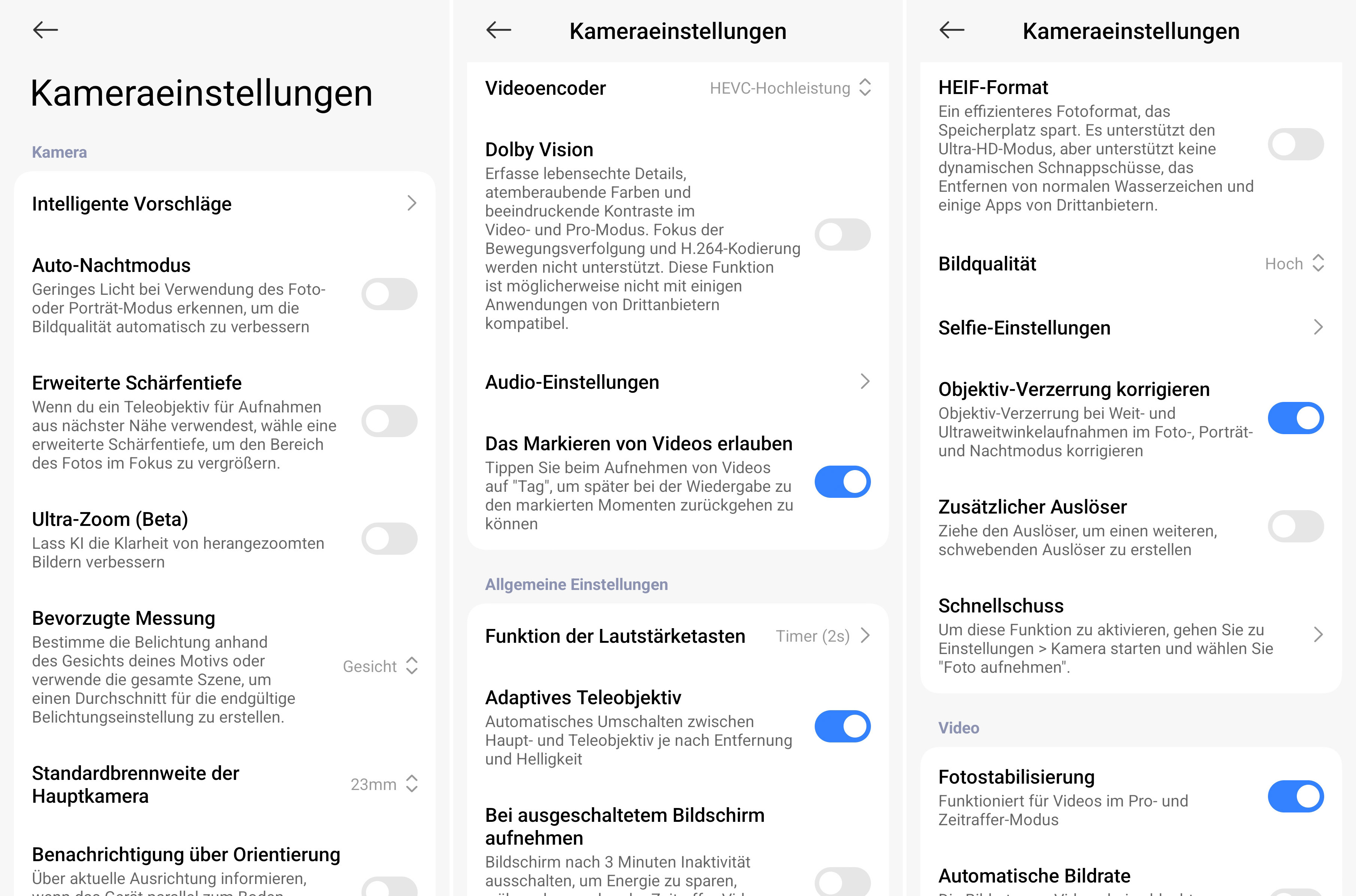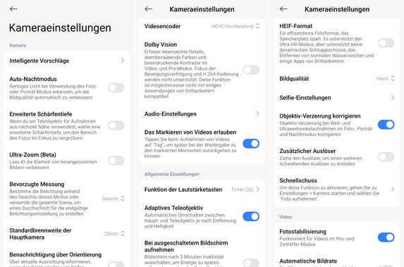 Bei wenig Licht kann man die kleineren Sensorabmessungen durch den Einsatz des Nachtmodus teilweise ausgleichen, zur besseren Nachbearbeitung lassen sich mit allen drei Kameras auch RAW-Dateien speichern. Die Kamera-App bietet viele Optionen, Videos nimmt das Xiaomi 15 mit bis zu 8K30p auf. Das geht allerdings nur mit der Hauptkamera. 4K60p unterstützen dagegen alle drei Rückseitenkameras, weshalb diese Auflösung und Bildrate im Alltag sinnvoller sind.