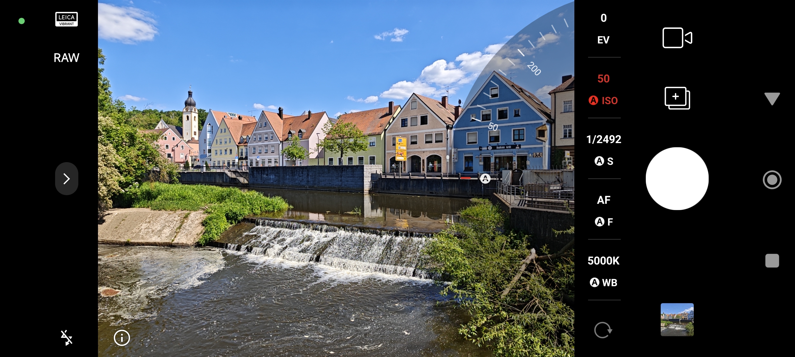 Für die manuelle Steuerung gibt es wie üblich den „Pro“-Modus. Hier lässt sich der Bildstil (z. B. Normal, Leica BW NAT, Leica Sepia, KC64) auswählen und kann man alle Aufnahmeparameter beeinflussen. Konkret handelt es sich dabei um die Belichtungskorrektur (-4 EV bis +4 EV), den ISO-Wert (50 bis 12.800), die Verschlusszeit (von 30 Sekunden bis zu 1/8.000 Sekunde), den Fokus (nur bei der Haupt- und der Telekamera) und den Weißabgleich (2.000 K bis 8.000 K). Diese Optionen sind nicht nur für Fotos, sondern auch für Videoaufnahmen verfügbar.