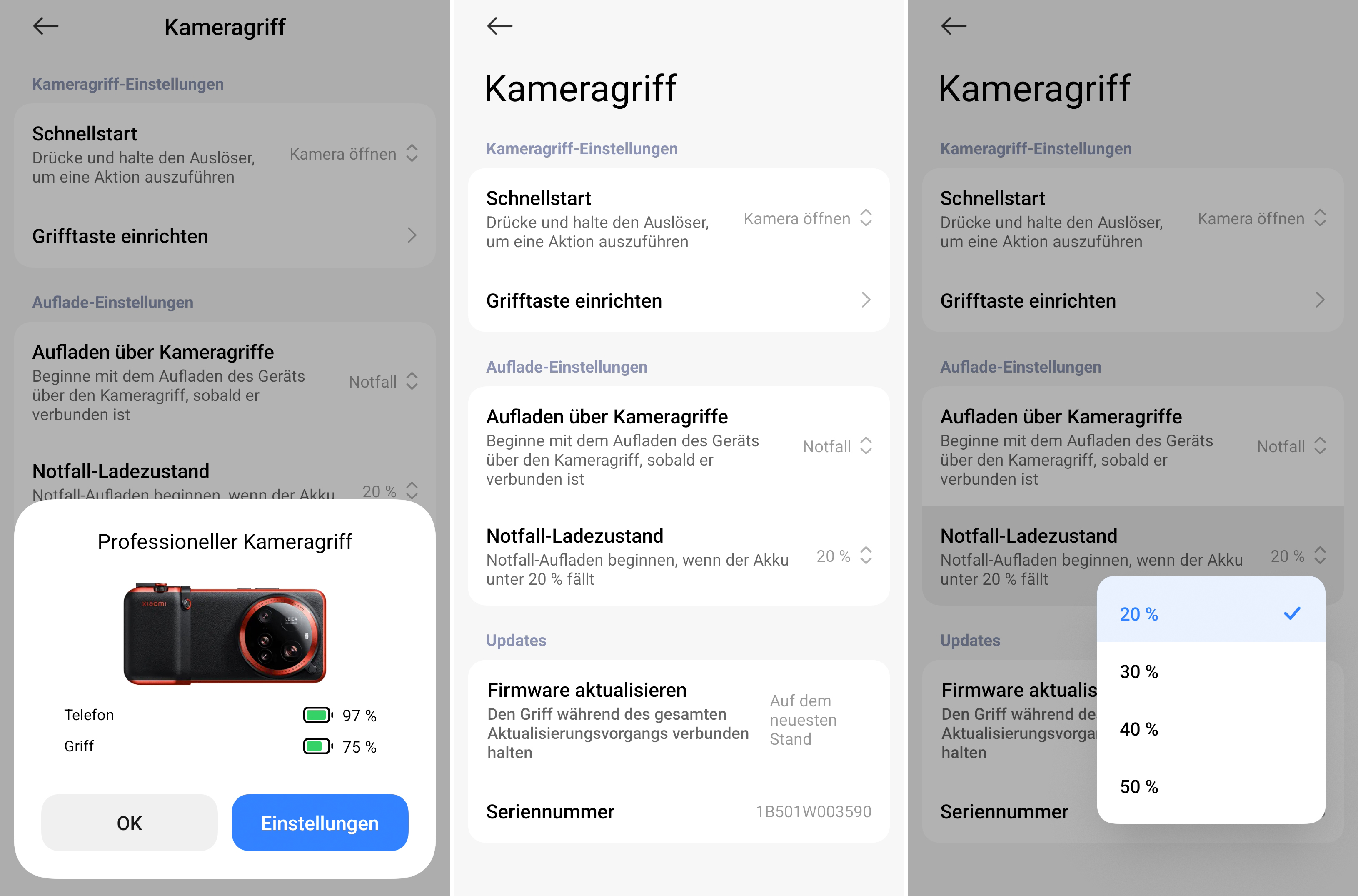 Als weiteren Vorteil verfügt der Griff über einen eingebauten Akku mit 2.000mAh (7.82Wh). Das entspricht rund einem Drittel der Kapazität des integrierten Akkus des Xiaomi 15 Ultra (5.410mAh). Standardmäßig lädt der Akku im Griff den Akku des Smartphones bei einem Ladestand von weniger als 20 % auf, dies lässt sich im Menü jedoch auch ändern. Abgedichtet ist der Griff leider nicht vollständig, sondern nur nach IP54-Standard. Staub und Spritzwasser stellen daher kein Problem dar, mit dem Griff darf man das Xiaomi 15 Ultra allerdings nicht mehr untertauchen. Das ist nicht optimal. Im Alltag dürfte diese Einschränkung für die meisten aber wohl keine größere Rolle spielen.