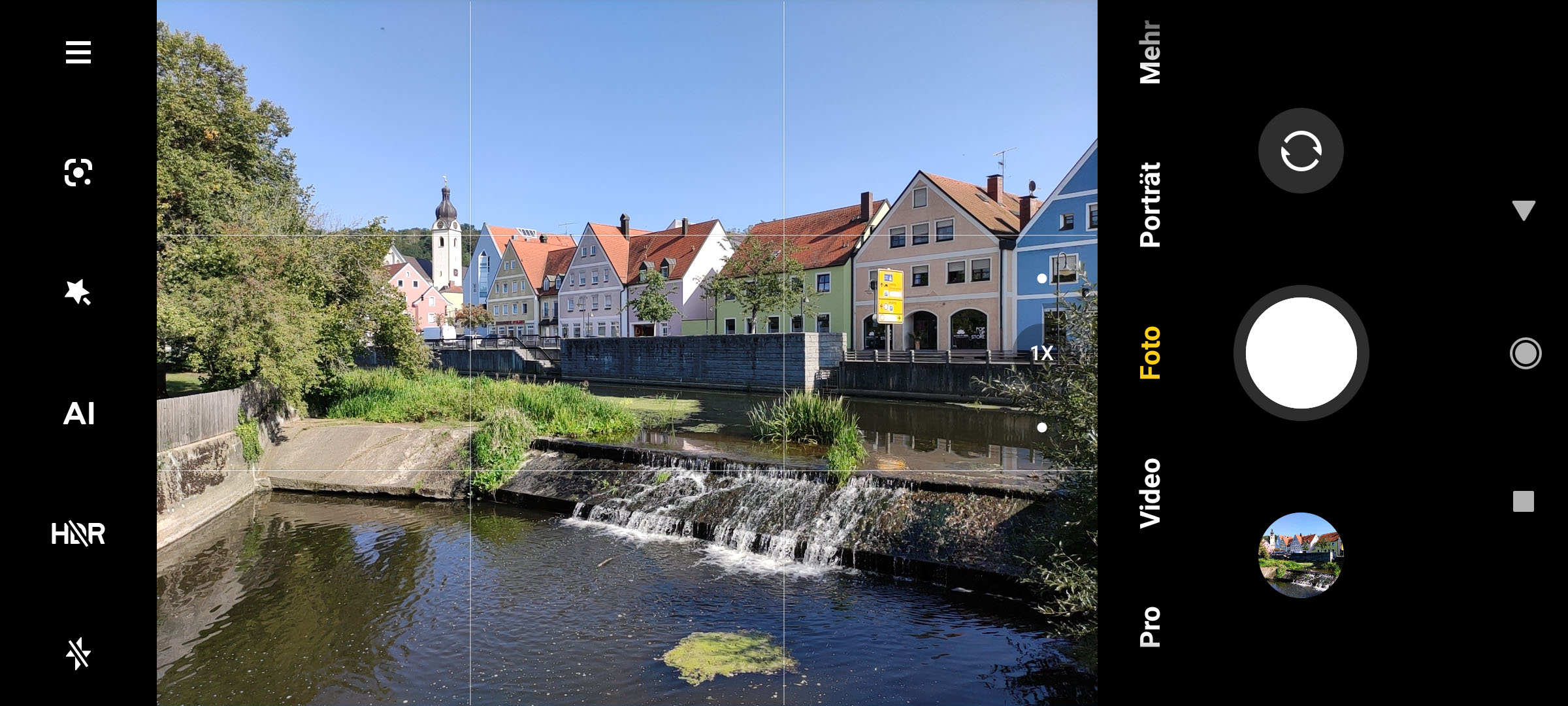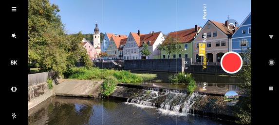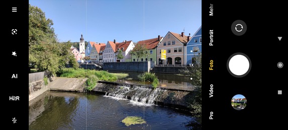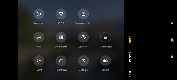 Die Aufnahmeprogramme liegen rechts vom Livebild, wie üblich gibt es dafür einen Slider. Zu erreichen sind hier der Pro-Modus, der Video-Modus, der herkömmliche Foto-Modus und ein Porträt-Modus. Weitere Modi lassen sich über „Mehr“ einstellen. Dazu gehören ein Zeitlupen-Modus, ein Kurzvideo-Modus oder ein Panorama-Modus. Gut zu wissen: Beim „64M“ genannten Programm handelt es sich um einen gewöhnlichen Fotomodus, hier nutzt man jedoch die volle Auflösung der Kamera von 64 Megapixel statt 16 Megapixel.