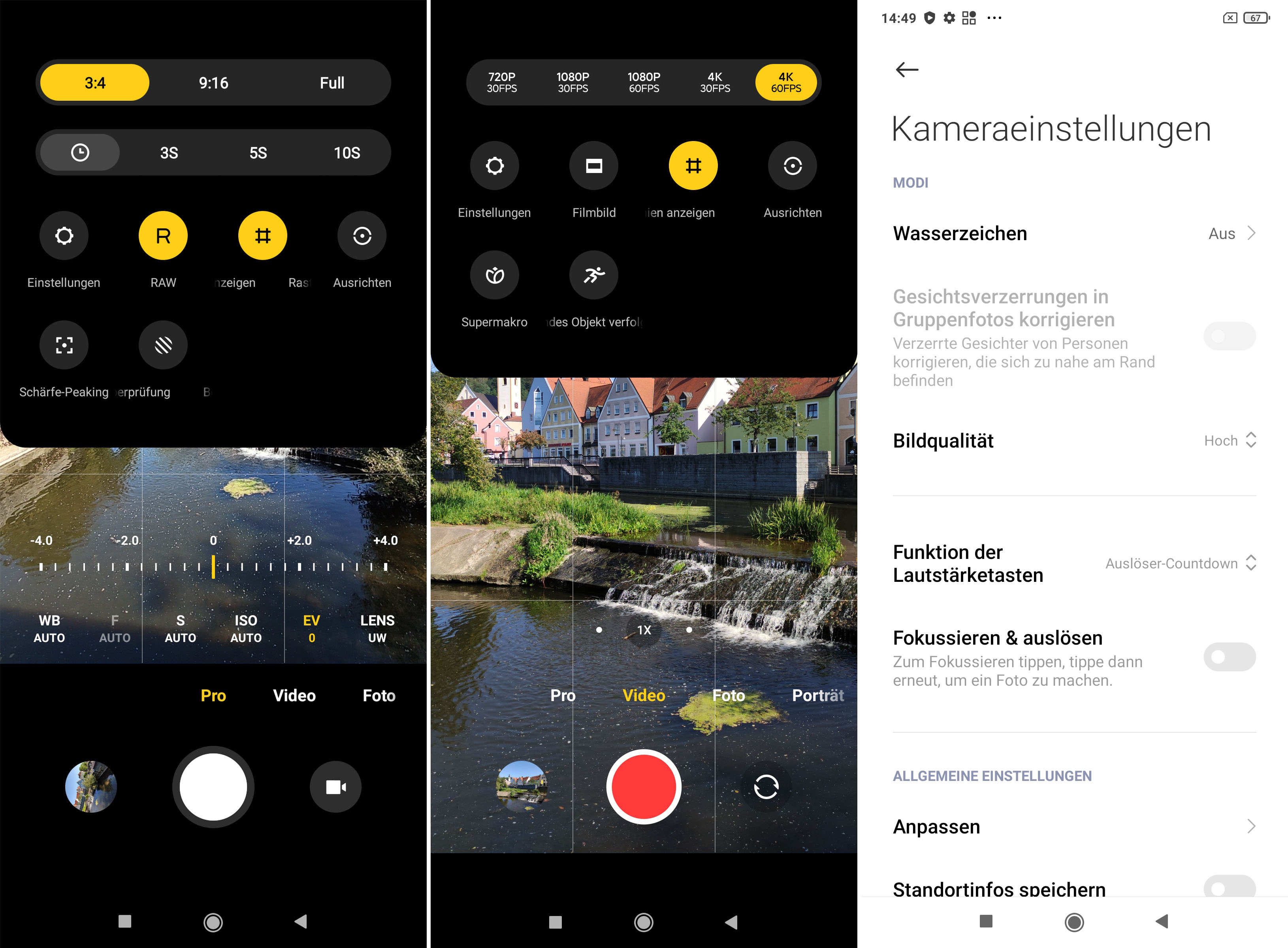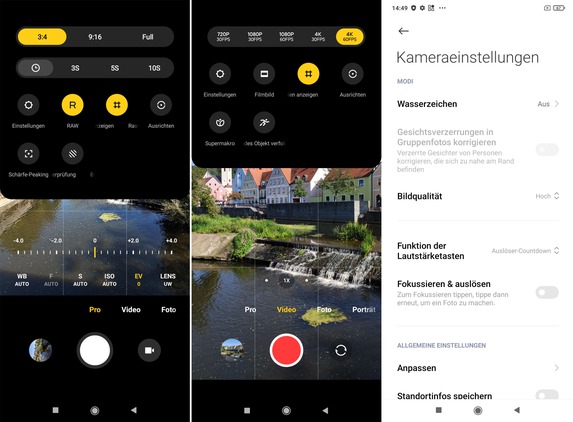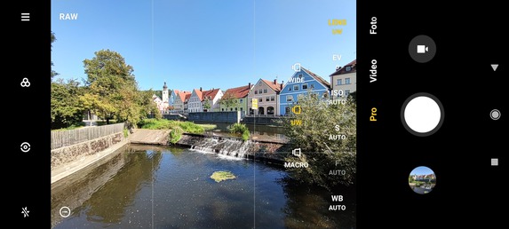 Wer der Automatik der App nicht vertraut oder einfach selbst tätig werden möchte, wechselt zum Pro-Modus. Dieser erlaubt das Einstellen des Weißabgleichs (u. a. „Glühlampe“, „Sonne“ und manuelle Wahl der Farbtemperatur), des Fokusabstandes, der Belichtungszeit (1/4.000 Sekunde bis 30 Sekunden), der Sensorempfindlichkeit (ISO 100 bis ISO 6.400) und der Belichtungskorrektur (minus vier bis plus vier Blendenwerte in Drittelstufen). Diese Angaben gelten jeweils für die Hauptkamera, bei der ebenso anwählbaren Ultraweitwinkel- und Makrokamera gibt es teilweise abweichende Einstellungsmöglichkeiten.