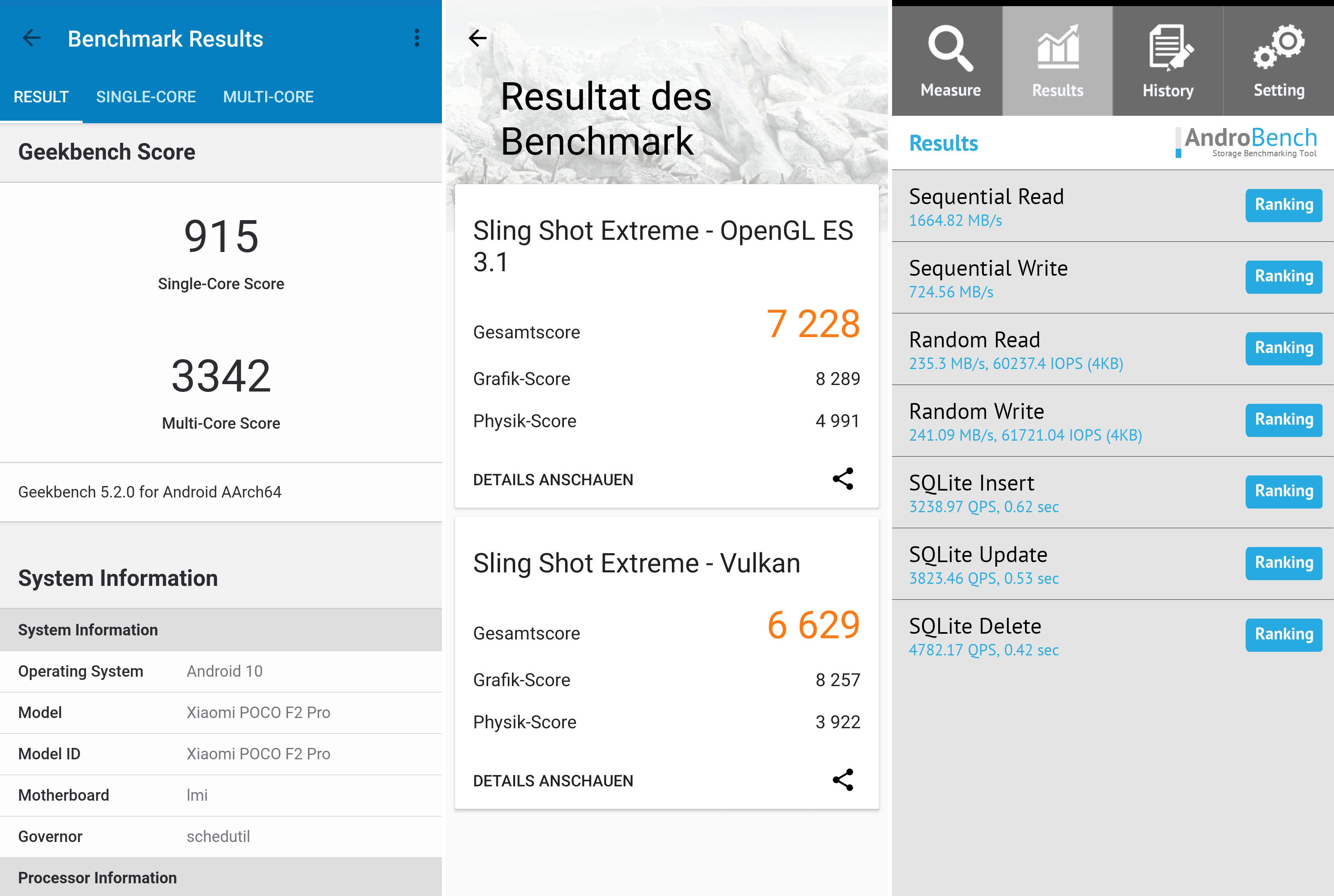 Dies sind für ein Smartphone für deutlich unter 1.000 Euro UVP exzellente Wert. Nicht anders sieht es beim integrierten Speicher aus. Lesend erreicht dieser 1.665MB/s, schreibend 725MB. Besser geht es aktuell kaum. In der Praxis kann man sich natürlich ebenfalls nicht beklagen. das Poco F2 Pro arbeitet ausgesprochen schnell.