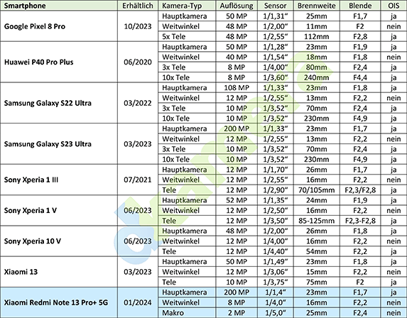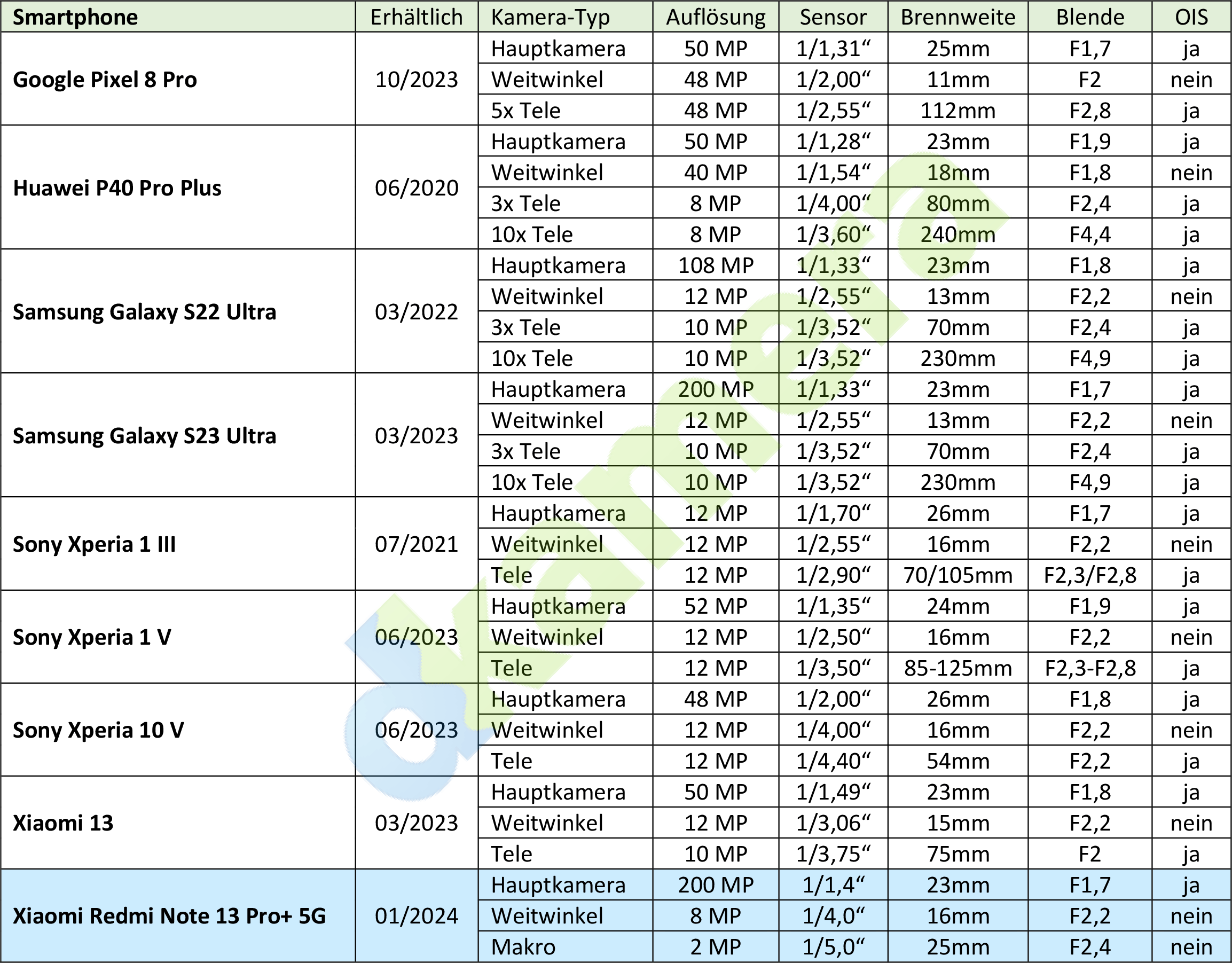 Bei der Kamera-Ausstattung des Redmi Note 13 Pro+ 5G hat Xiaomi zweifellos den Fokus auf die Hauptkamera gelegt. Hier kommt ein extrem hochauflösender Sensor mit 200 Megapixel zum Einsatz. Konkret handelt es sich um den Samsung Isocell HP3. Er gehört zur 1/1,4-Zoll-Klasse, ist also etwas größer als die oftmals bei Mittelklasse Smartphones verwendeten 1/1,5-Zoll- oder 1/1,7-Zoll-Sensoren. Die hohe Auflösung (16.320 x 12.288 Pixel) sorgt aber natürlich für sehr kleine Bildpunkte, diese besitzen eine Kantenlänge von lediglich 0,56µm.