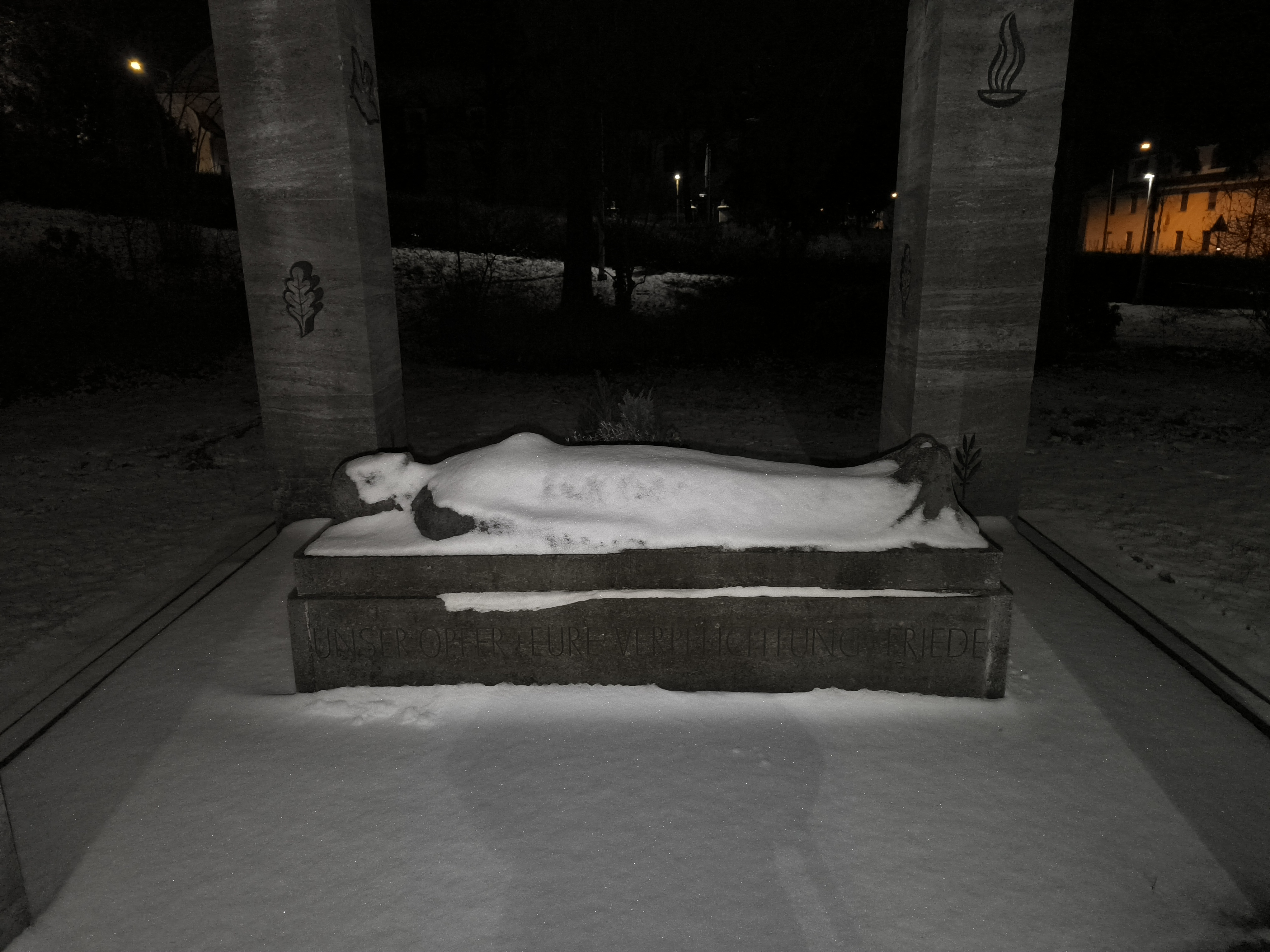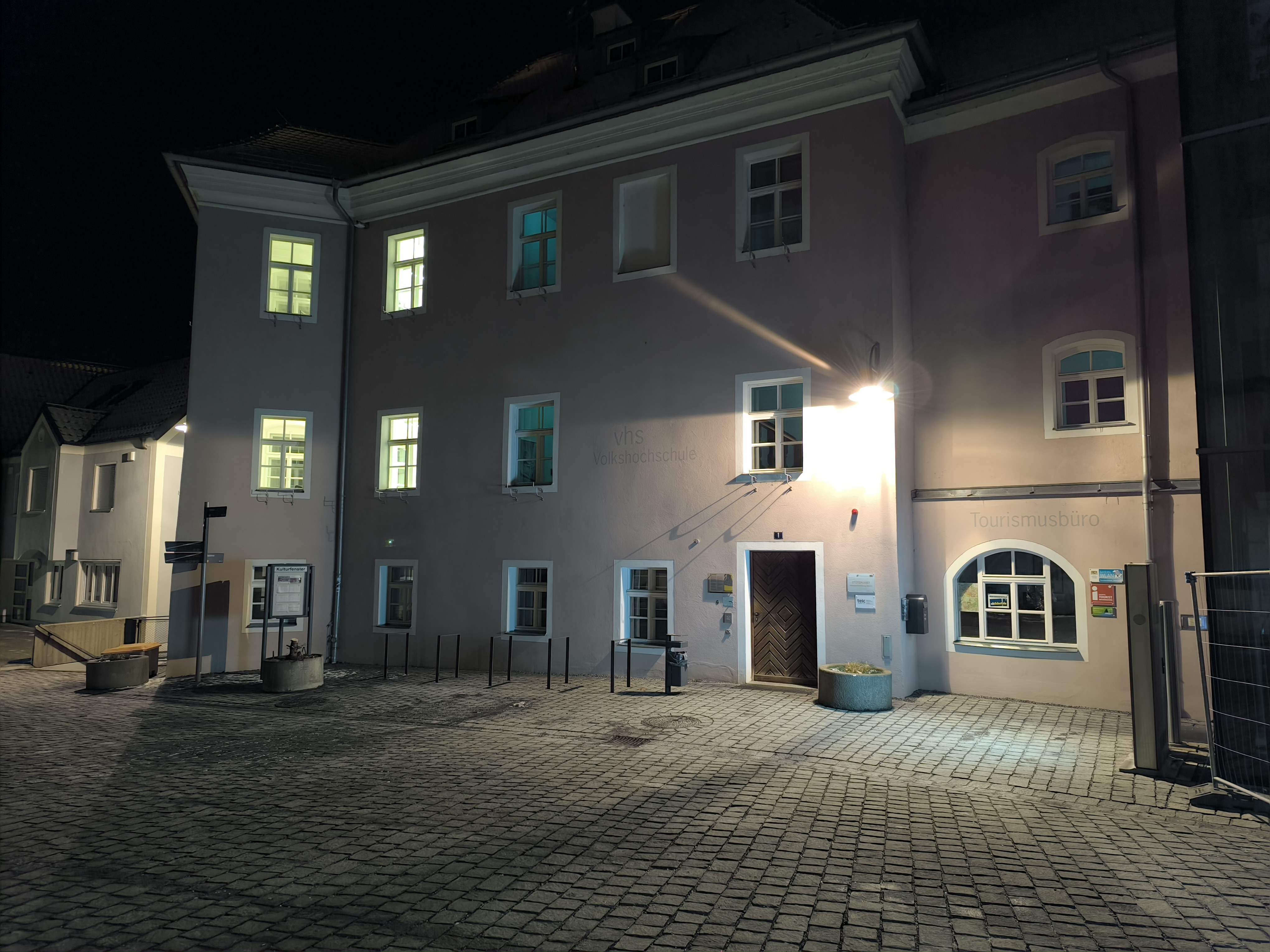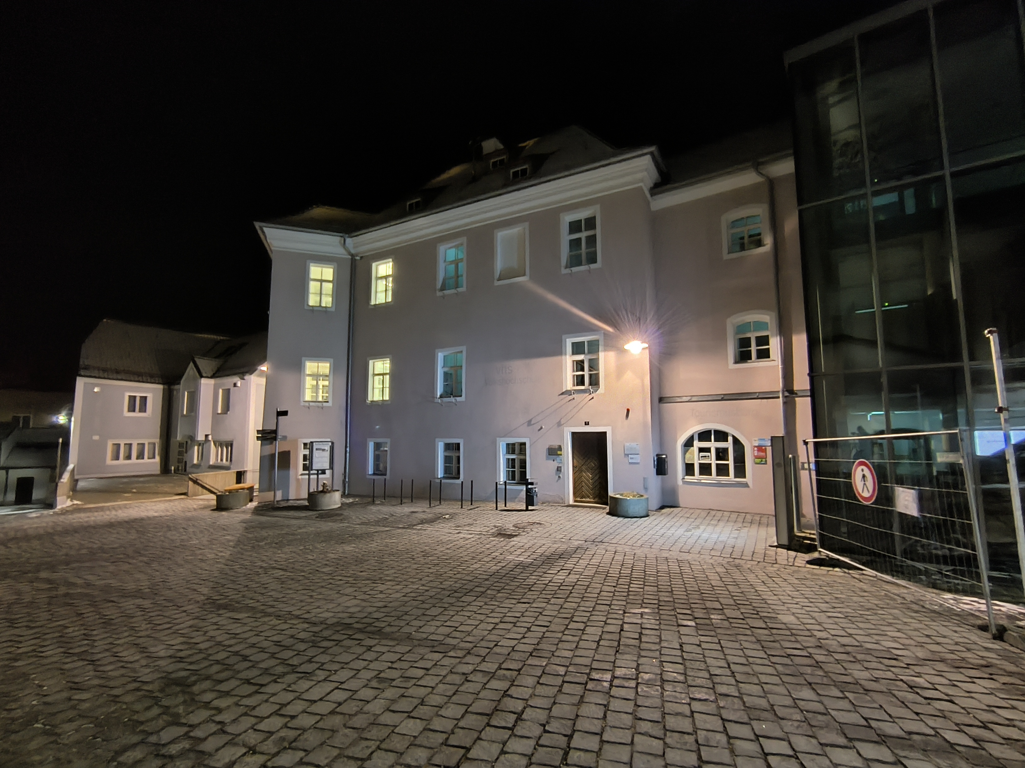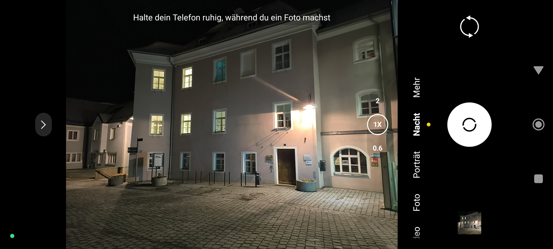 Die Bildqualität der Ultraweitwinkelkamera fällt bei schlechten Lichtverhältnissen wie erwartet viel stärker ab. Unser Testbild zeigt ein extrem starkes Rauschen und wenig Details. Bei schlechten Lichtverhältnissen ist man daher stets auf den Nachtmodus angewiesen. Dieser sorgt für eine deutliche Verbesserung, zu mehr als einer noch akzeptablen Qualität reicht es aber trotzdem nicht. Wir meinen daher: Sofern die Lichtverhältnisse schlechter werden, ist der Einsatz der Hauptkamera stets die beste Option. Auf die Bildqualität der Makrokamera bei Nacht braucht man angesichts des kleinen Sensors kaum eingehen, wenn überhaupt sollte diese nur bei guten Lichtverhältnissen verwendet werden. Wenig Licht sorgt bei ihr immer für eine schlechte Wiedergabe, der Nachtmodus lässt sich als zusätzlicher Nachteil nicht verwenden.