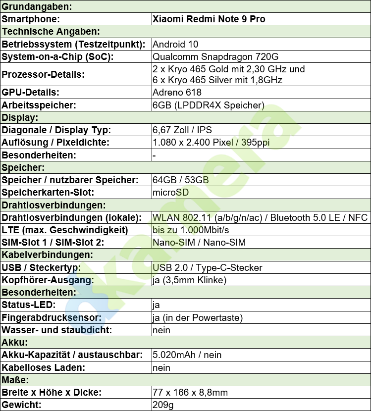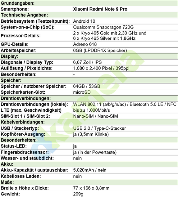 Das Xiaomi Redmi Note 9 Pro verfügt über ein 6,67 Zoll großes IPS-Panel mit einer Auflösung von 2.400 x 1.080 Pixel. Wie mittlerweile üblich besitzt das Panel ein sehr längliches Seitenverhältnis, hier sogar von 20:9. Corning Gorilla Glas soll für eine hohe Robustheit sorgen, der typische Kontrast liegt laut Herstellerangabe bei 1.500:1. Als SoC verbaut Xiaomi einen Qualcomm Snapdragon 720G mit acht Kernen. Zwei Kerne Kryo 465 Gold-Kerne mit jeweils 2,3GHz übernehmen fordernde Aufgaben, sechs Kryo 465 Silver-Kerne mit 1,8GHz sollen bei geringer Last möglichst viel Strom sparen. Die Adreno 618-GPU übernimmt Grafikberechnung, 6GB Arbeitsspeicher dienen als schneller Zwischenspeicher. Der integrierte Speicher ist je nach Version 64GB (unser Testmodell) oder 128GB groß, mittels microSD-Karte lässt sich dieser erweitern.
