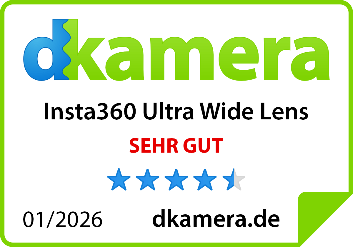 Die Ultra Wide Lens, auf Deutsch auch Ultraweitwinkel-Objektiv genannt, vergrößert den Bildwinkel laut Insta360 von 157 Grad auf 189 Grad und bietet dadurch einen deutlich größeren Bildwinkel. Zu beachten ist beim Einsatz der Ultra Wide Lens allerdings, dass Aufnahmen nur mit dem Ultra- sowie dem Mega-Sichtfeld erfolgen können. Die Fisheye-Verzerrungen fallen aufgrund des riesigen Bildwinkels natürlich sehr stark auf und machen die Aufnahmen nicht mehr für alle Aufnahmesituationen tauglich.