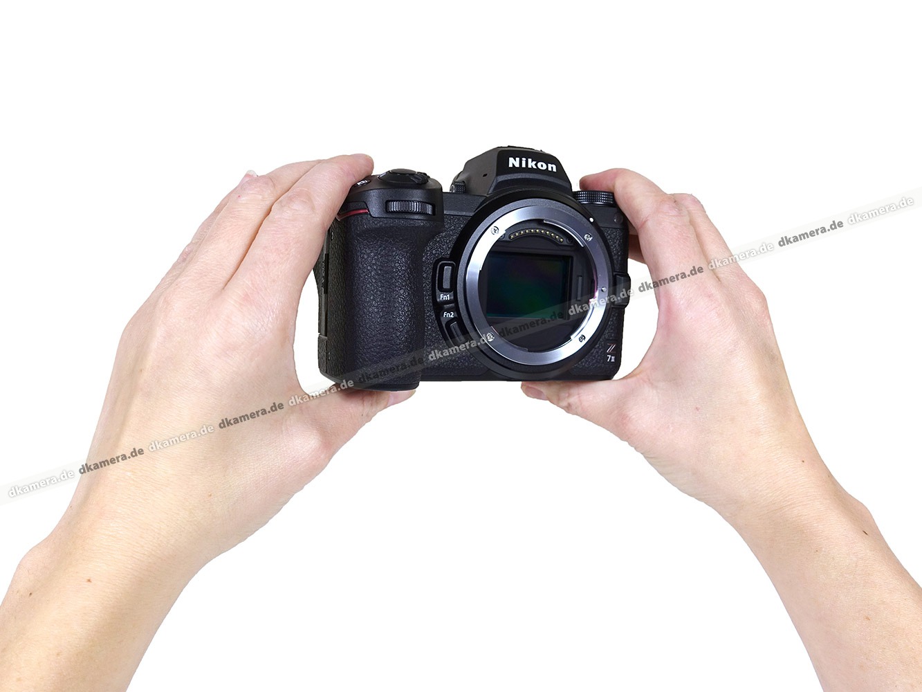 folgt auf die Z 7, beim Gehäuse gleicht die spiegellose Systemkamera dem Vorgängermodell. Auf der Vorderseite der Kamera liegen zwei Fn-Tasten, des Weiteren lässt sich hier die Arretierung des Bajonetts lösen. Im Griff hat Nikon wie üblich ein Einstellrad zur Wahl der Blende integriert, auf dem Griff befinden sich der Fotoauslöser und der Ein-/Ausschalter. Des Weiteren lassen sich über drei Direktwahltasten weitere Einstellungen verändern. Das Kontrolldisplay der Nikon Z 7II (Technik) informiert über die wichtigsten Parameter (Blende, Belichtungszeit, ISO, freier Platz auf der Speicherkarte, ...), das zweite Einstellrad der DSLM liegt daneben. Bedient wird dieses allerdings mit dem Daumen über die Rückseite. Die Programmwahl erfolgt per Rad auf der linken Kameraschulter, vor dem Drehen muss man dieses mit der mittigen Taste entsichern. Wer den Sucher aktivieren oder die Sucher-Umschaltung konfigurieren möchte, kann das mit der Taste an der rechten Seite des Suchers.