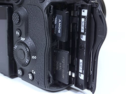 Als Speicherkarten lassen sich bei der Kamera CFexpress Typ-A- sowie SD-Modelle nutzen. Im ersten Slot finden beide Kartentypen Platz, im zweiten Slot lassen sich nur SD-Modelle einsetzen.