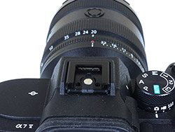Ein Blitzgerät ist bei der Sony Alpha 7 V nicht verbaut, externe Modelle lassen sich jedoch über den Zubehörschuh nutzen. Dieser erlaubt über Zusatzkontakte zudem den Anschluss eines externen Mikrofons.