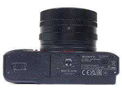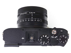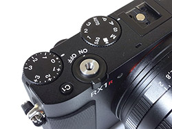 Auf der Oberseite hat Sony zwei Einstelläder sowie den kombinierten Ein-/Ausschalter und Fotoauslöser platziert. Während Letzterer mit dem Zeigefinger bedient wird, verwendet man bei den Rädern aufgrund der flachen Integration im Gehäuse den Daumen.