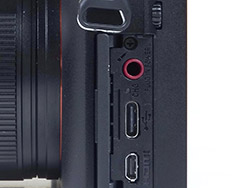 Die Kabelschnittstellen sind bei der RX1R III an der linken Seite zu finden. Hier kann man ein Mikrofon via 3,5mm-Klinkenbuchse anschließen, das Bildsignal über Micro-HDMI ausgeben sowie den Akku per USB-C-Buchse aufladen.